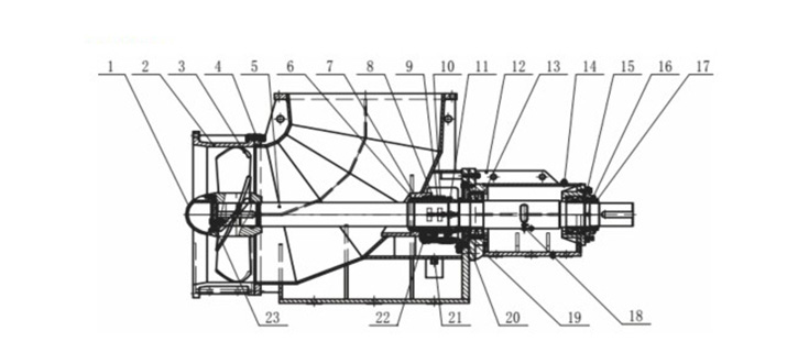 1-導流(liu)罩 2-入(ru)口短(duan)節 3-葉(ye)輪 4-泵(beng)體 5-軸(zhou) 6-襯套(tao) 7-軸套(tao) 8-水封(feng)環 9-水(shui)封環(huan)填料(liao)壓蓋(gai) -10填料(liao)壓 12-軸(zhou)面座(zuo) 13-軸承(cheng) 14-氣孔(kong)蓋 15-軸(zhou)承擋(dang)套 16-後(hou)軸承(cheng)壓蓋(gai) 17-後擋(dang)醋盤(pan) -18油垃(la)部位(wei) -19前軸(zhou)毋壓(ya)蓋 -20前(qian)擋酸(suan)盤 -21洩(xie)液管(guan) 22-管接(jie)頭 23-軸(zhou)唱墊(nian)采用(yong)懸臂(bi)式結(jie)構,結(jie)構簡(jian)單,維(wei)修方(fang)便,不(bu)^用拆(chai)卸泵(beng)體和(he)管線(xian),葉輪(lun)反裝(zhuang)💁🏼♀️即可(ke)改變(bian)介質(zhi)流向(xiang)。
