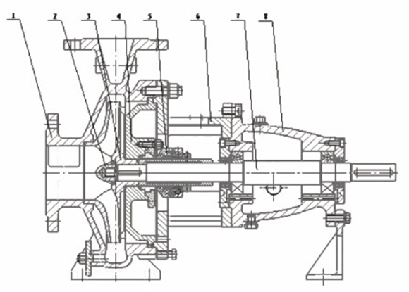 (1)泵(beng)體;(2)葉輪螺(luo)母;(3)葉輪件(jian);(4)泵蓋;(5)密封(feng)部件;(6)中間(jian)支架;(7)軸;(8)懸(xuan)架部件